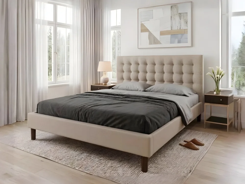 Buy Dora Bed Frame from Bed and Pillows. We use premium grade wooden frame and Premium quality upholstery fabric and High density foam for headboard which provides extra support to your head and back when you relax by sitting.